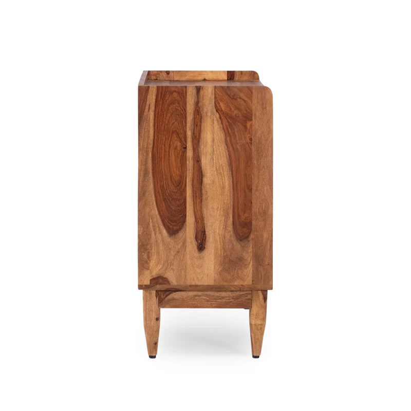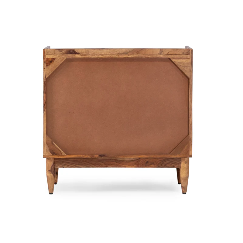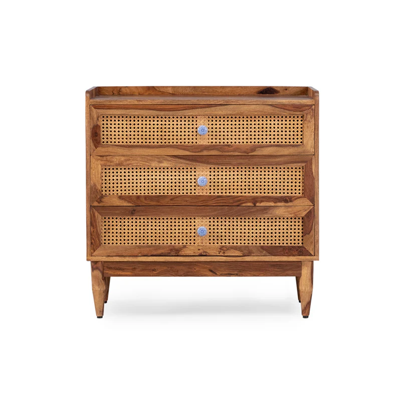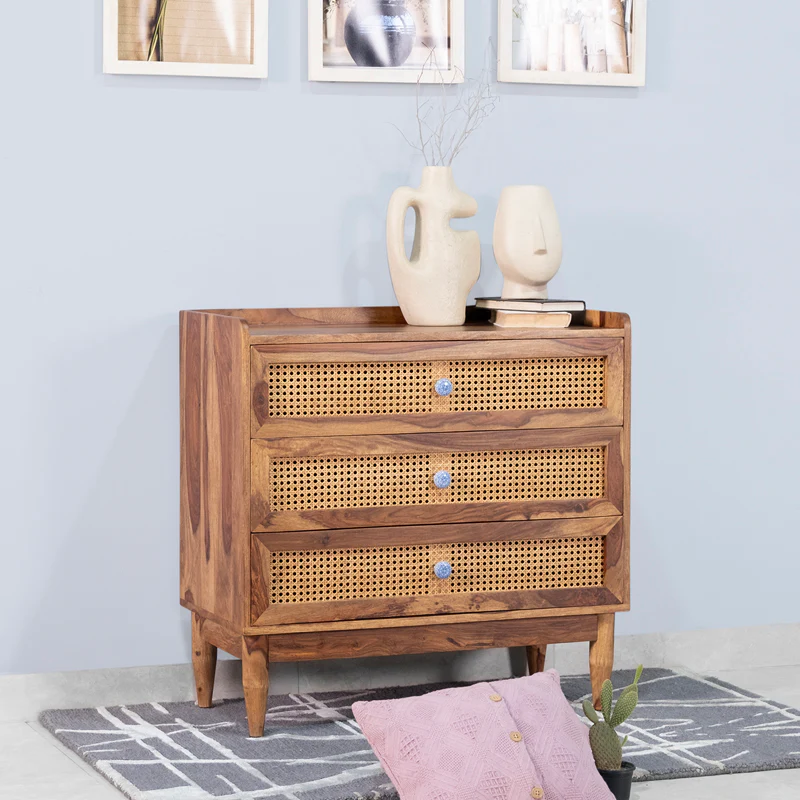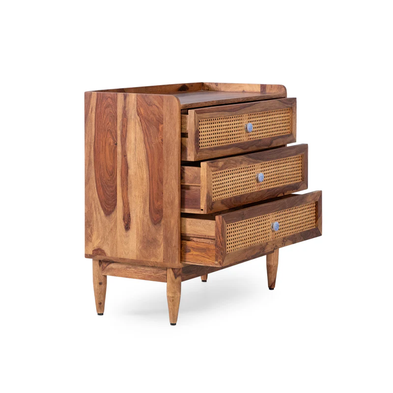Crafted from high-quality Sheesham wood, this cabinet ensures durability and timeless appeal. The three spacious drawers provide ample storage for your essentials, from linens and cutlery to personal belongings. The cane accents add a modern yet natural touch, blending seamlessly with various interior styles.