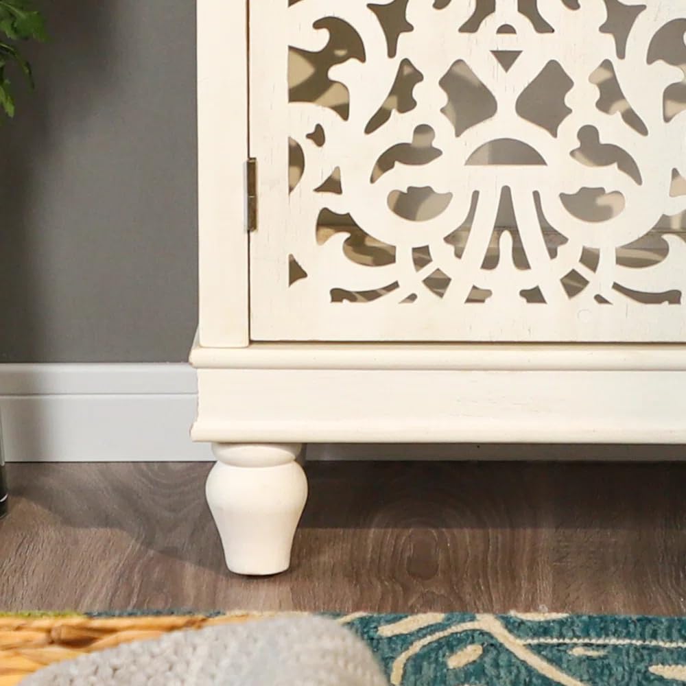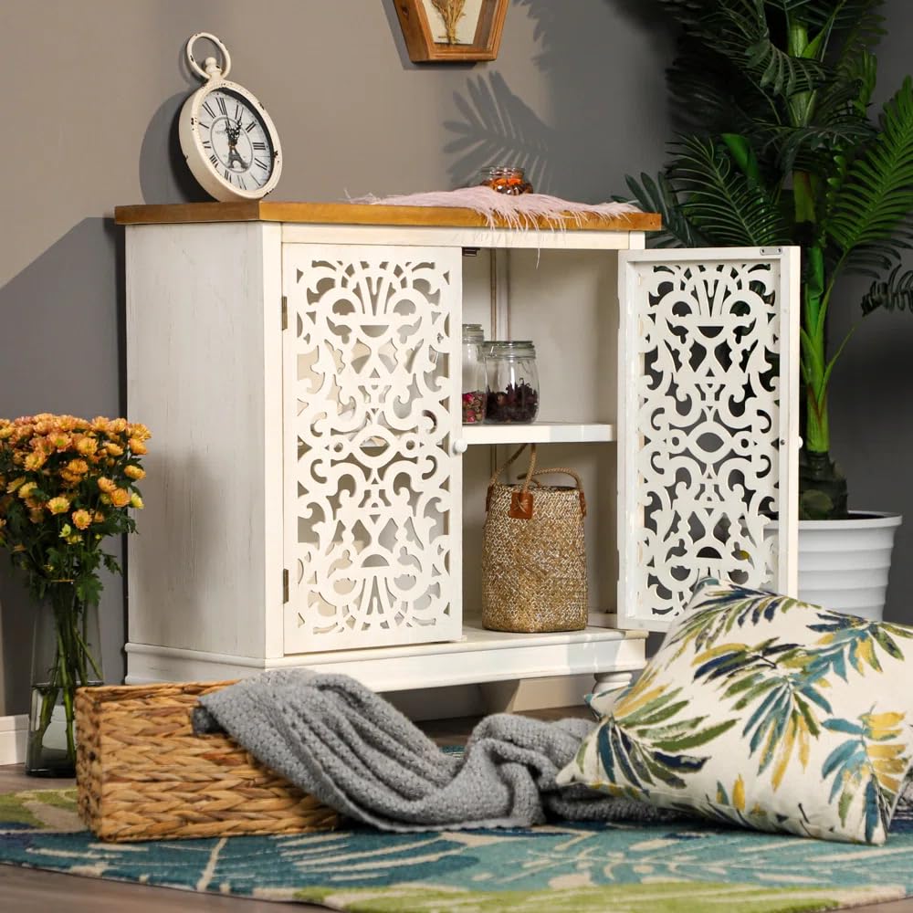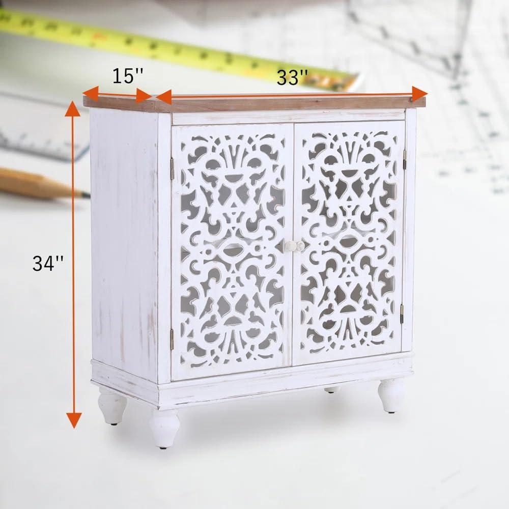 In addition to its concealed storage, the cabinet features an open shelf design, perfect for displaying your favorite family photos, plants, or decorative accents. This thoughtful balance of hidden storage and open display ensures that your living room remains both organized and personalized. Measuring 33 inches wide, 15 inches deep, and 34 inches tall, its compact proportions make it perfectly suited for placing under windows, along walls, or as a stand-alone statement piece.