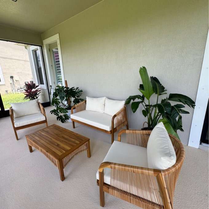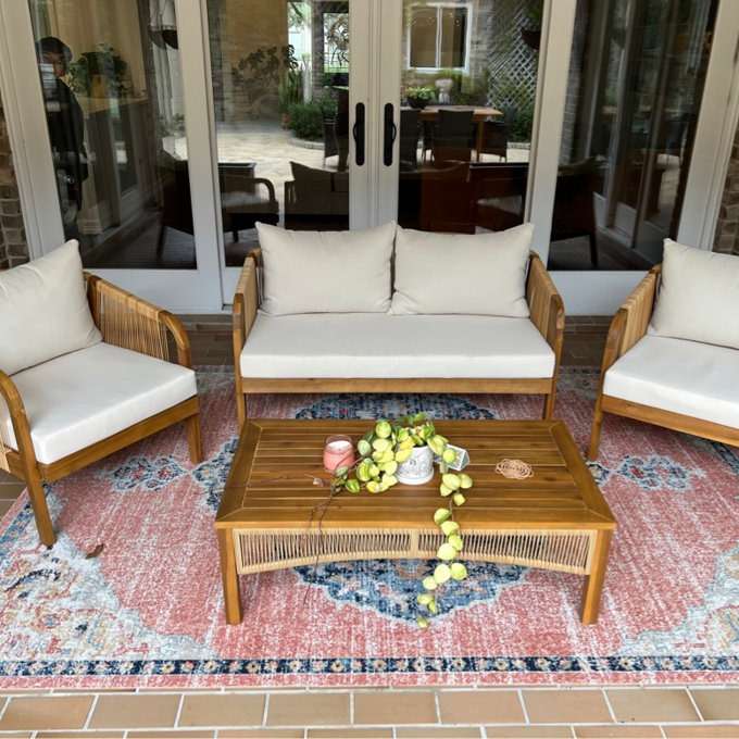 With its low-profile table, two cozy chairs, and spacious loveseat, this set is perfect for casual conversations, reading outdoors, or enjoying your favorite drink. Its natural tones and relaxed style blend effortlessly into any outdoor setting—be it a cozy balcony or a sunny garden patio.